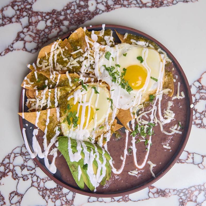 Home made fried Chips, Tomatillo Sauce, Black Beans, crema, cheese, egg, avocado.